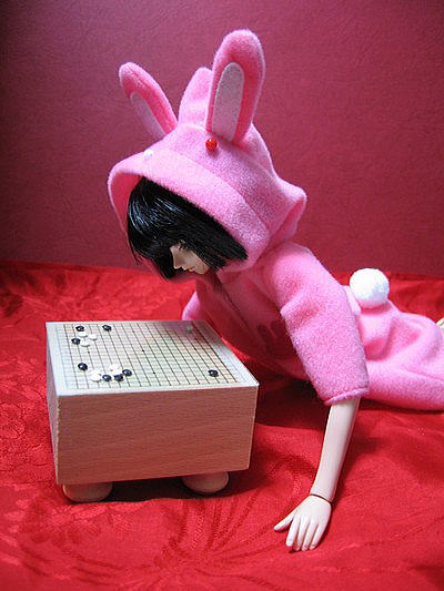 彼の名前はアキラ。囲碁をこよなく愛するウサギです。 アキラは一人で、大きな木の割れ目の中に住んでいます。 入り口が葉っぱで隠されているので暗いけど、 碁盤の上の黒石、白石はちゃんと見分けられるので、 アキラは気にしていませんでした。 ある日アキラが散歩に出掛けると、 野原にぽつんと碁盤があるのに気が付きました。まだ打ち掛けのようですが、対局者らしき姿は見当たりません。 周囲に人影がないのを確かめて、アキラは近づいて行きました。