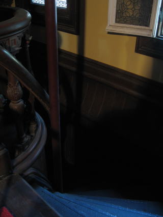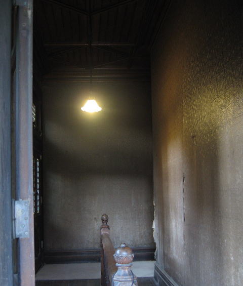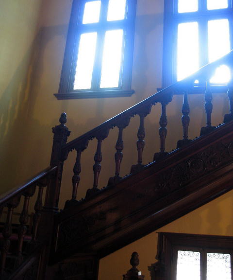 階上へと向かう磨き上げられた階段と、…